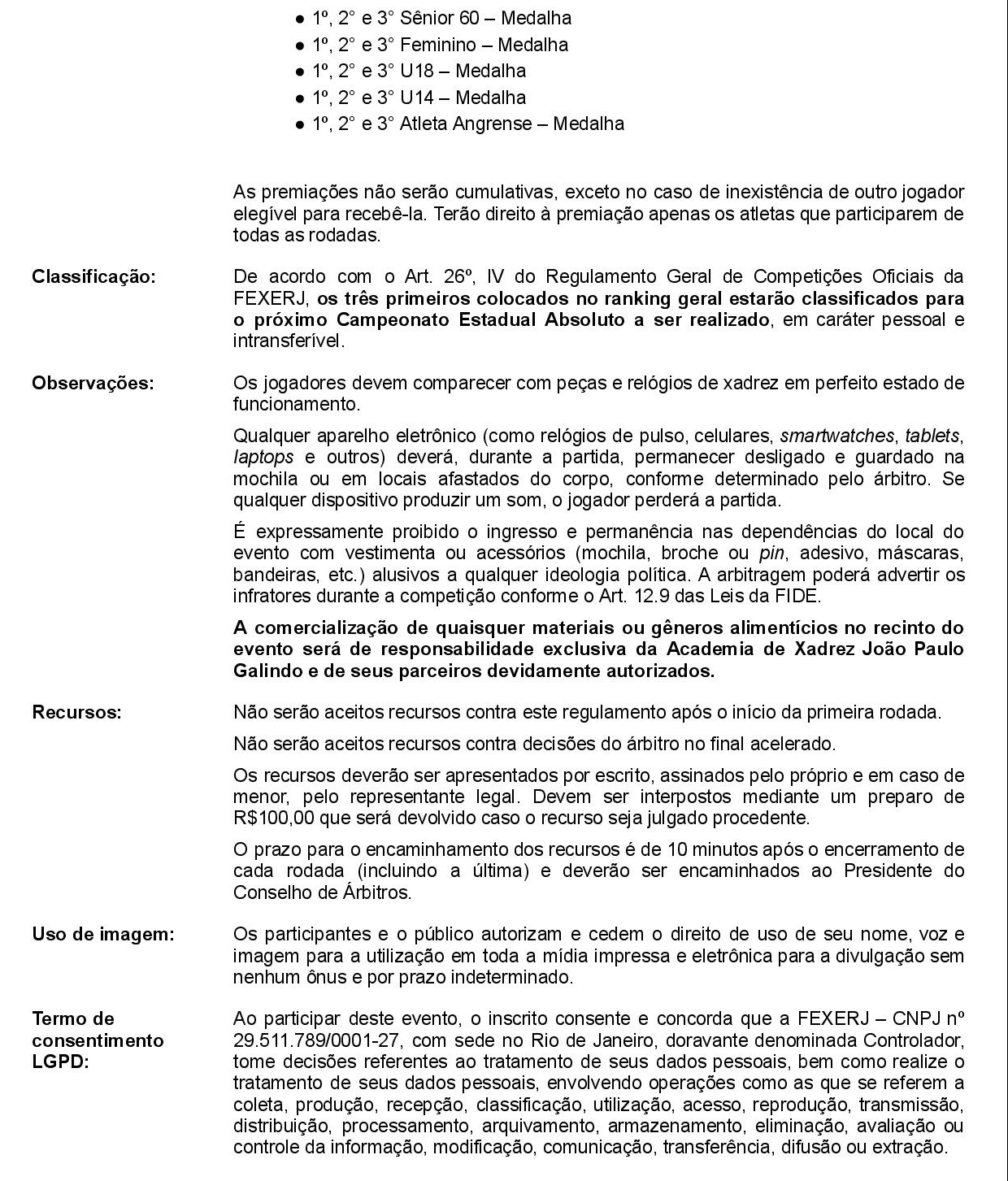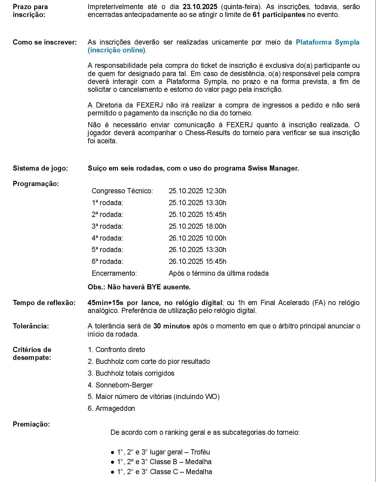 Este torneio é uma verdadeira celebração do xadrez fluminense! Mais do que uma competição, o evento tem como objetivo estimular a prática e o crescimento do xadrez em todo o estado, promover a movimentação do rating FEXERJ, Contribuir para o cálculo da Taça Eficiência (Art. 38, IV do RGCO); Contribuir para o Troféu Destaque (Art. 40 c/c Art. 38, IV do RGCO); classificar os melhores jogadores para o Campeonato Estadual Absoluto, além de valorizar o espírito esportivo e o companheirismo que unem nossa comunidade.