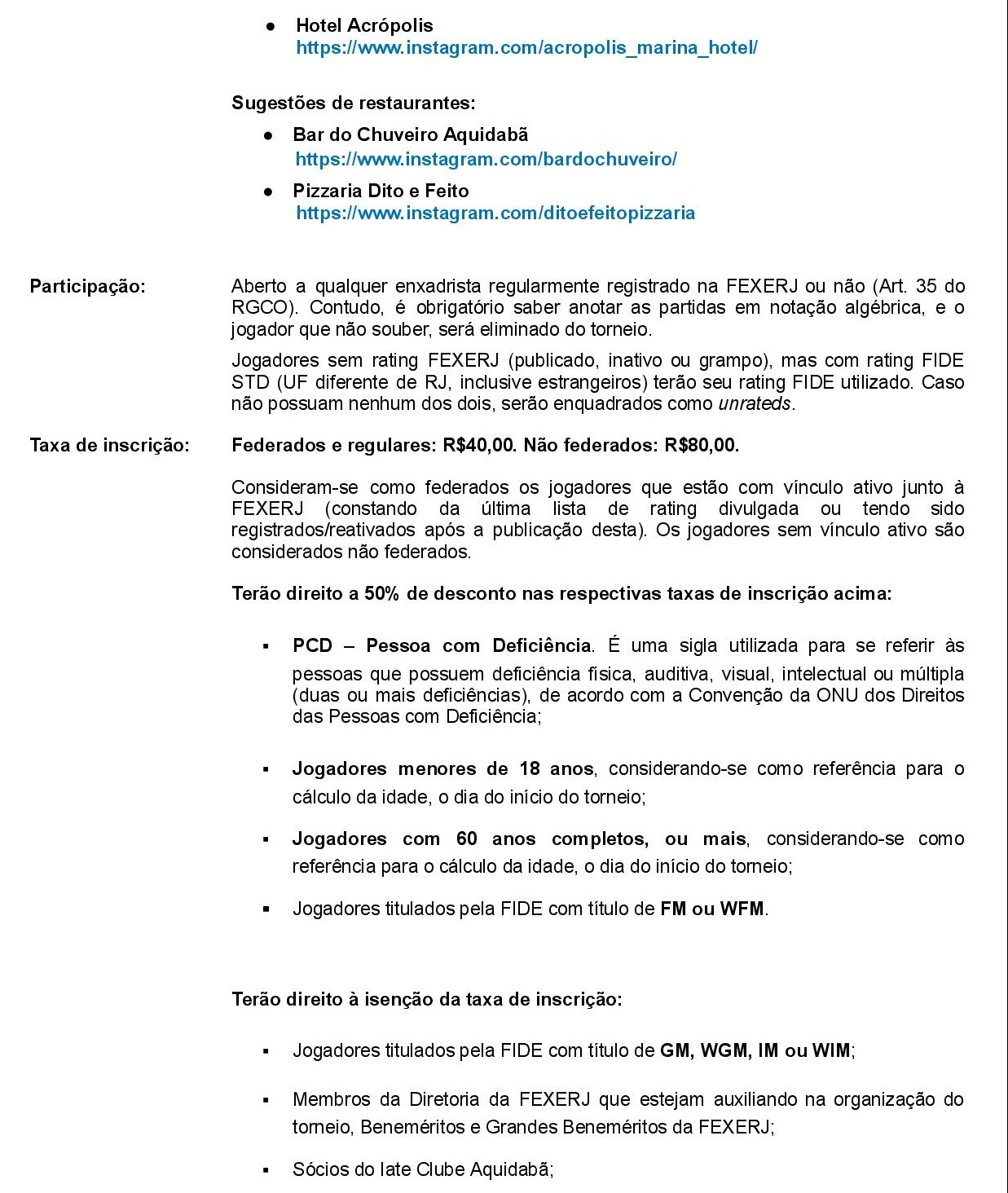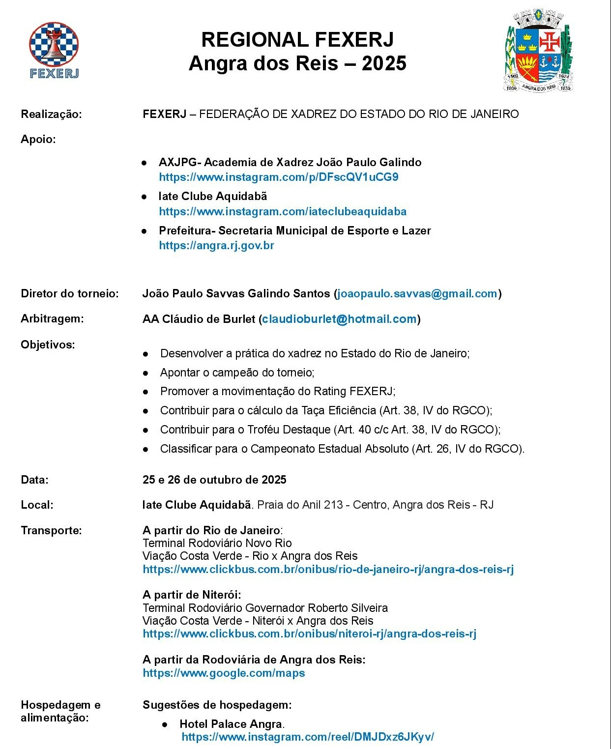 É com imensa alegria que a Federação de Xadrez do Estado do Rio de Janeiro (FEXERJ) dá as boas-vindas a todos os enxadristas, familiares e amantes do esporte da mente para mais uma edição do Regional FEXERJ, que neste ano acontece na paradisíaca cidade de Angra dos Reis, nos dias 25 e 26 de outubro de 2025, no tradicional Iate Clube Aquidabã.