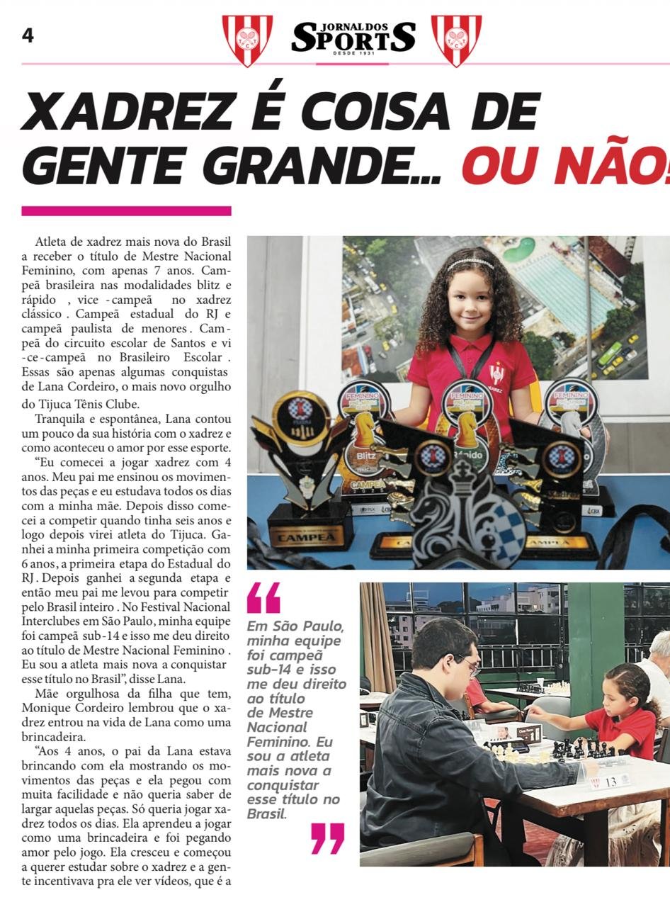 Lana é hoje o orgulho do Tijuca Tênis Clube e um símbolo inspirador para toda a comunidade enxadrística. Sua história mostra que o xadrez é, sim, coisa de gente grande… mas também de pequenos gênios que encantam o tabuleiro com coragem e inteligência.