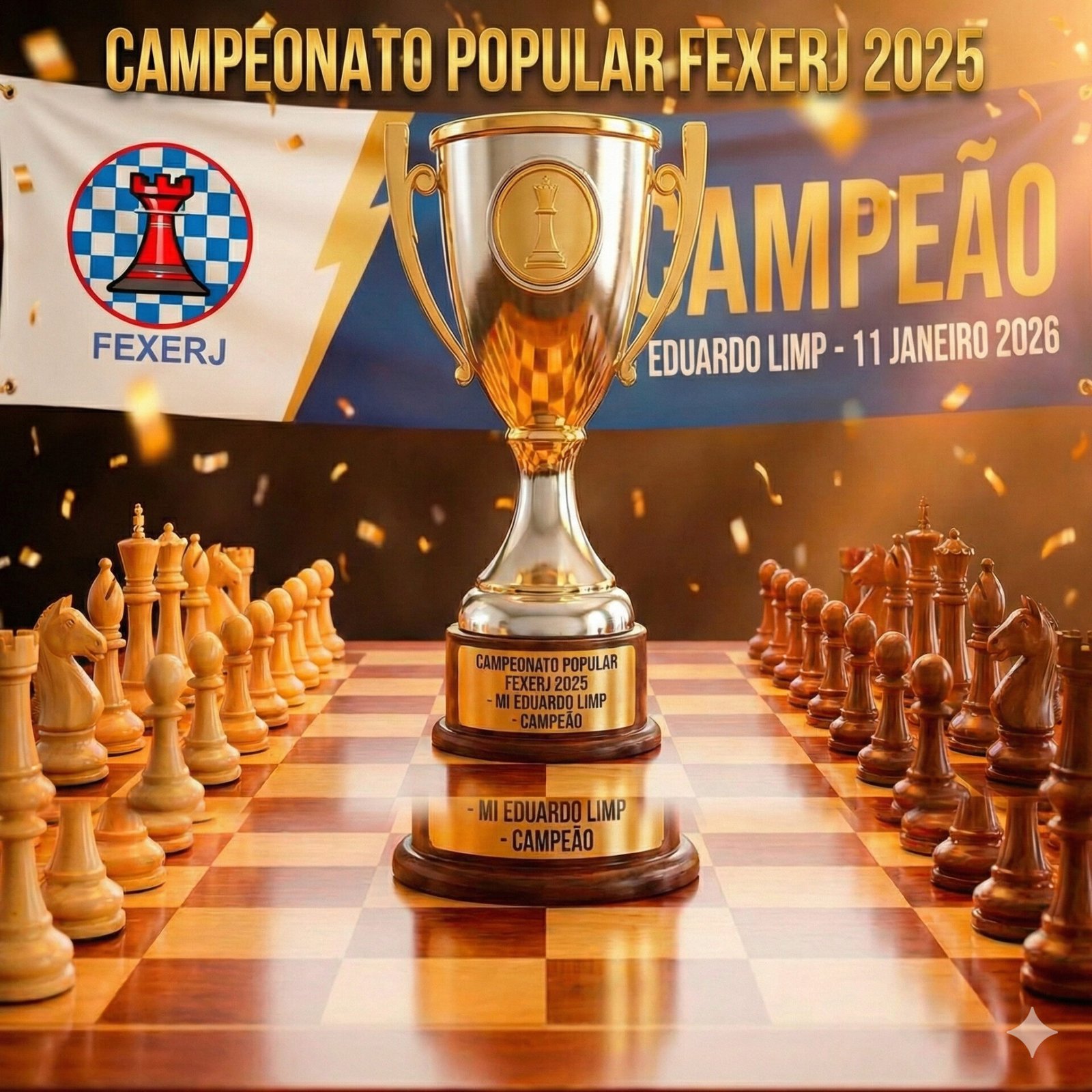 Texto: O ano começou com força total no xadrez fluminense! Nos dias 10 e 11 de janeiro de 2026, realizamos o Campeonato Popular FEXERJ 2025, um evento que fez jus ao nome, reunindo 117 enxadristas de diversas gerações e clubes em um clima de grande disputa e confraternização.