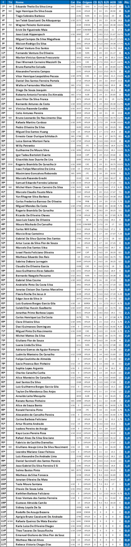 Confira o Top 10 da Classificação Geral: 1º IM Eduardo Thelio Da Silva Limp (CXG) – 5,5 pts 2º NM Iago Henrique Da Silva Souza (AFLUX) – 5,0 pts 3º Tiago Sobreira Barbosa (NXN) – 5,0 pts 4º Ian Telek C. De Albuquerque (ALEX) – 5,0 pts 5º FM Wagner Peixoto Guimarães (CMUN) – 5,0 pts 6º Erick De Figueiredo Maia (CXMEIER) – 5,0 pts 7º João Lizak Aipperspach (CXP) – 5,0 pts 8º Miguel Campos Da Silva Magalhães (AFLUX) – 4,5 pts 9º Maicon Rodrigo Da Silva (AFLUX) – 4,5 pts 10º FM Rafael Ventura Dos Santos (NXN) – 4,5 pts.