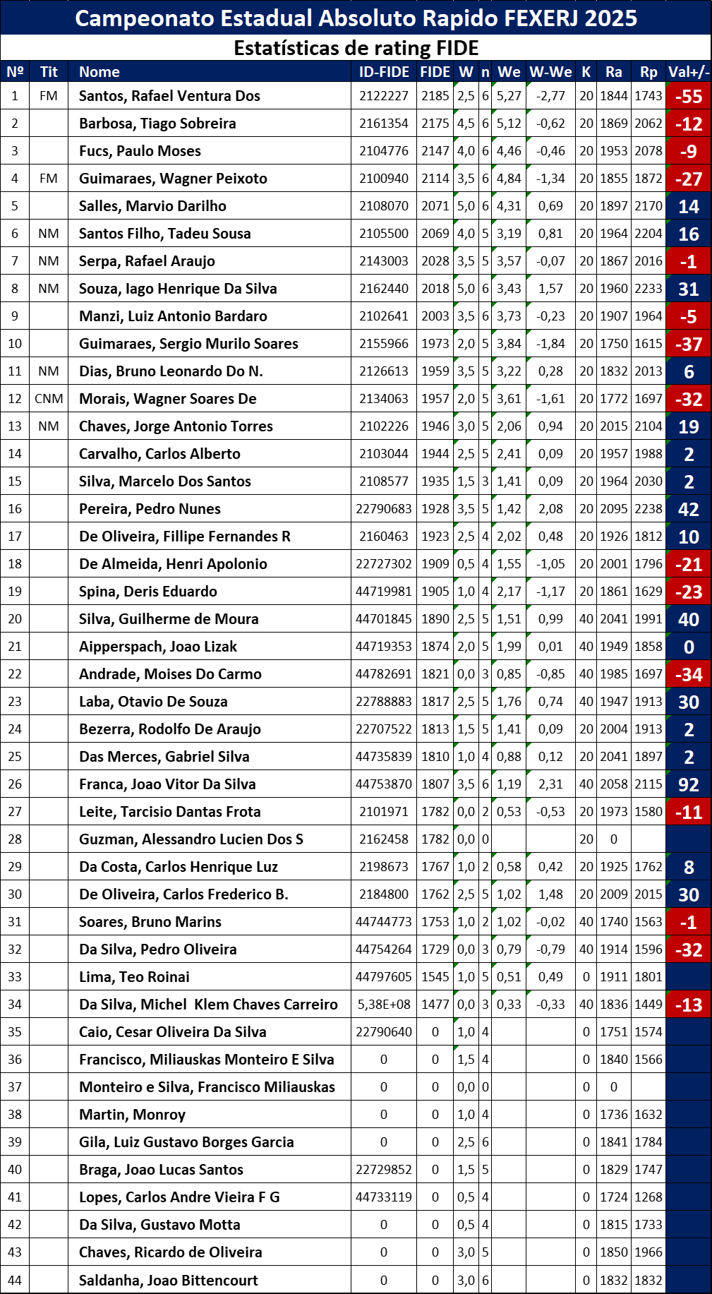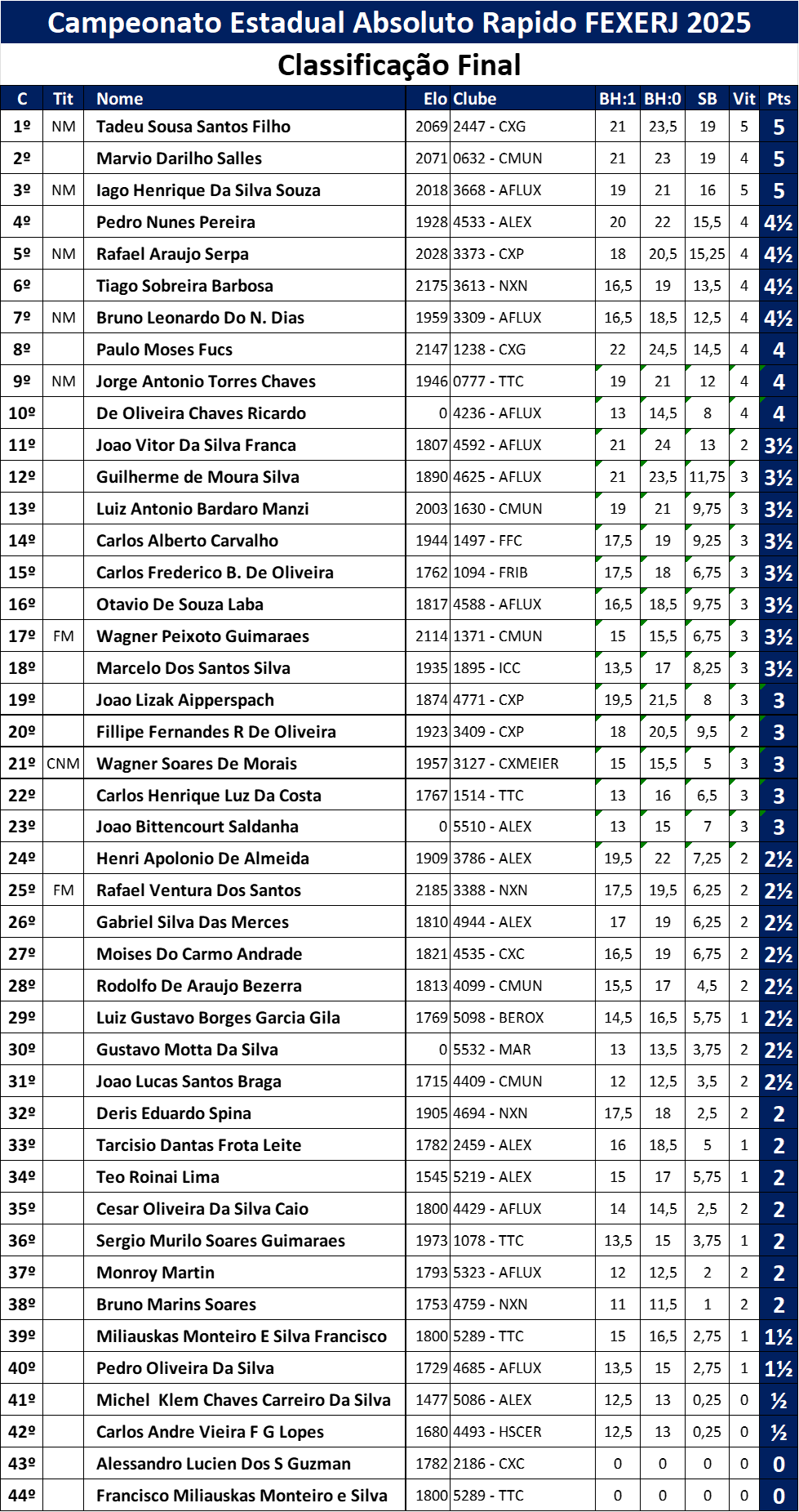 Reconhecimento a todos os participantes Cada enxadrista que se inscreveu e competiu contribuiu para o brilho deste evento. Seja com vitórias marcantes ou aprendizados valiosos, todos deixaram sua marca. A diversidade de clubes, faixas de rating e estilos de jogo reforça o papel da FEXERJ como promotora de integração e desenvolvimento do xadrez no estado.