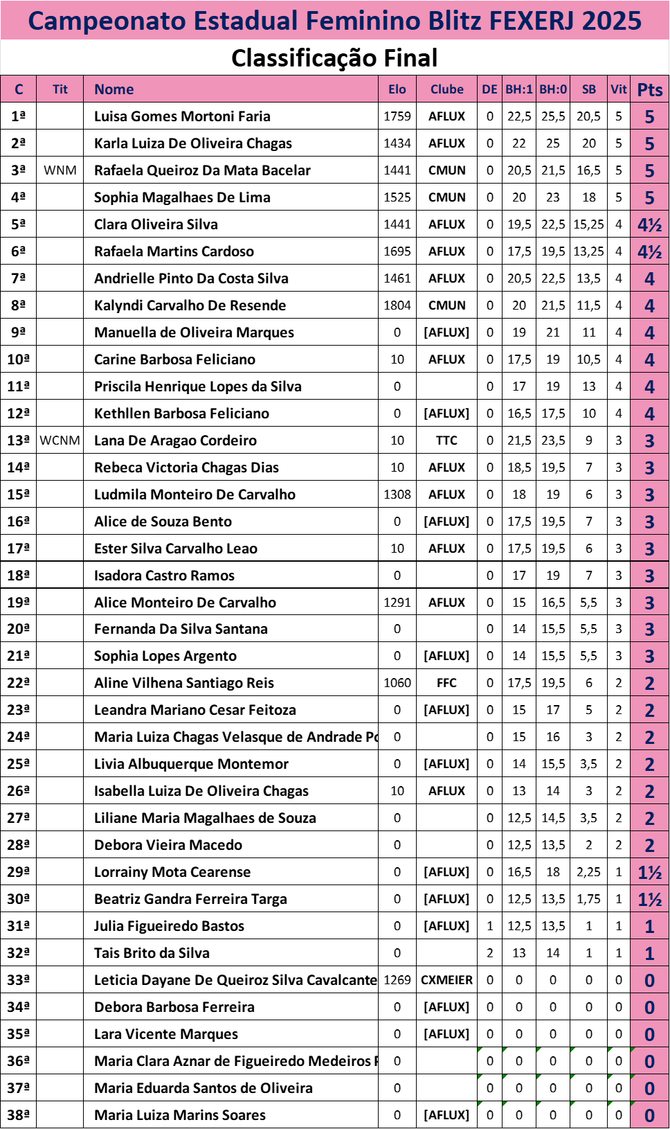Mais que um torneio, um movimento Este campeonato foi uma celebração da força feminina no xadrez. Com representantes de diversas faixas etárias e clubes como Aflux, Cmun, Nxn e Ttc, vimos o crescimento de talentos emergentes e a consolidação de nomes já respeitados no circuito. A presença de jogadoras da categoria U18 reforça o compromisso da FEXERJ com a formação de novas gerações e a democratização do esporte.