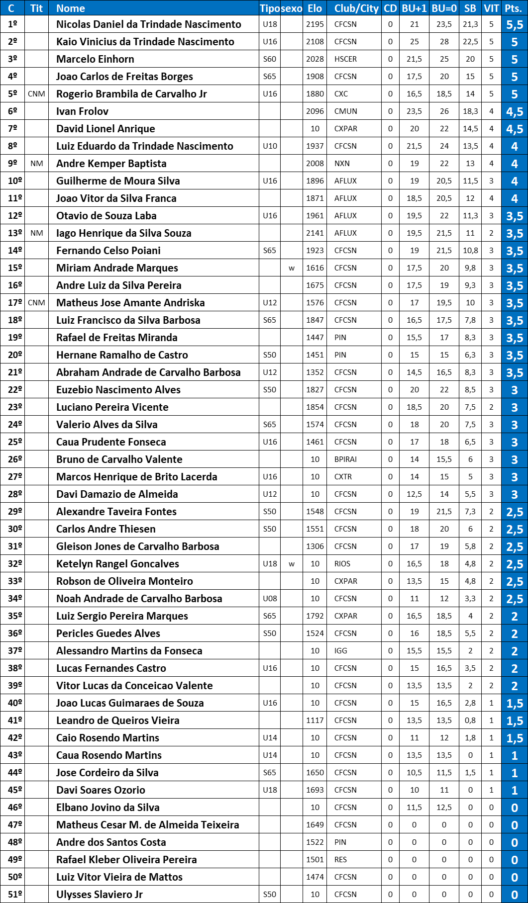 O grande campeão foi Nicolas Daniel da Trindade Nascimento (U18), do clube CFCSN, que brilhou com 5,5 pontos e demonstrou maturidade impressionante diante de adversários experientes. Logo atrás, seu irmão Kaio Vinicius da Trindade Nascimento (U16) garantiu o vice-campeonato com 5 pontos, consolidando a força da nova geração. O pódio foi completado pelo veterano Marcelo Einhorn (S60), do HSCER, que mostrou que a experiência segue sendo uma poderosa aliada no tabuleiro.